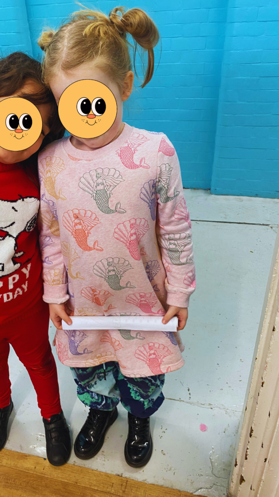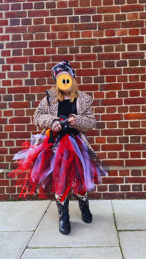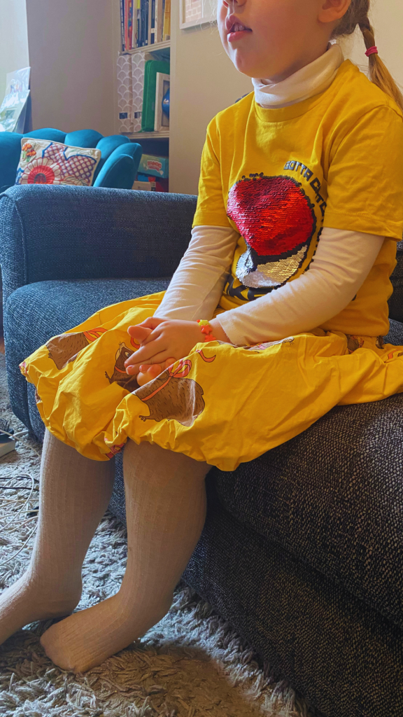 A new thought on the topic of kids and clothing came to me recently, upon seeing the outfit that my daughter had chosen for her non-uniform day at school. She had spent the night before at her dad’s house so her outfit was a total surprise to me when I spotted her while I was volunteering at the school. She paired a Boden mermaid sweater dress I’d purchased for her on Vinted with some blue and green tie dye joggers I found at Fara Kids for four pounds. To top it all off, she opted for some secondhand Doc Marten boots from her uncle, and two top knot Baby-Spice inspired buns on her head. It was a little wild, I’m not gonna lie.